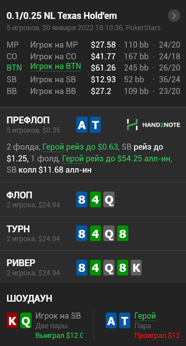 nakazator95 @ 30.01.22Оверплей с AQ , рука не плохо играется постфлоп в 3бп, ну ок. Получил 5бет, почему не выкинул? Странно. В итоге поставил 4бет и не смог выкинуть красивую.