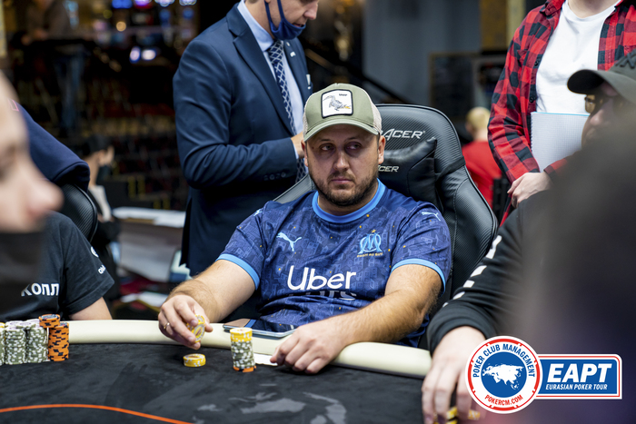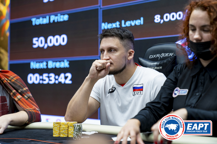 Димир Улбеков со стеком в 300 000 поставил префлоп олл-ин из середины на . Сидевший следом в 395 000 Григорий Зонов тоже пошёл ва-банк, остальные игроки выкинули. На префлопе Зонов был старше с , но к риверу от его стека осталось лишь 95 тысяч - на следующем уровне это будет всего пять блайндов.