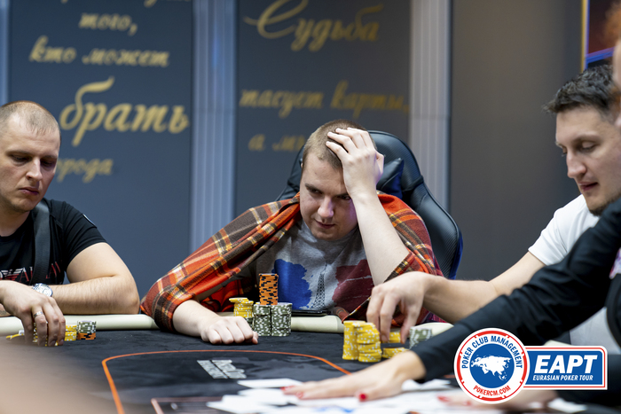 Роберт Фаизрахманов открылся 45 000 с первой, Сергей Иванов и Илья Барчуков зашли с блайндов. На флопе Роберт засибетил 25 000 и получил рейз от Сергея до 60 000. Илья выбросил, Роберт заплатил. Тёрн Иванов поставил 100 000, Фаизрахманов быстро уравнял. Ривер . Сергей сыграл чек, Роберт призадумался.