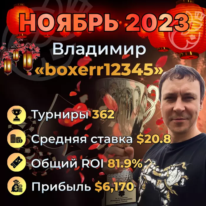 🥈Топ-2 забирает Владимир «boxerr12345». За 362 турнира его чистый плюс составил $6,170💰. Общий ROI - 81.9% с бай-ином $20.8.