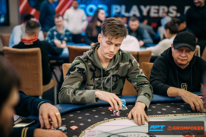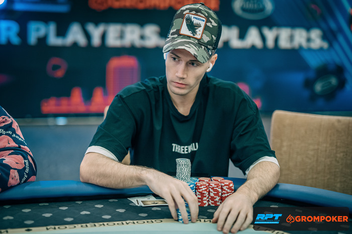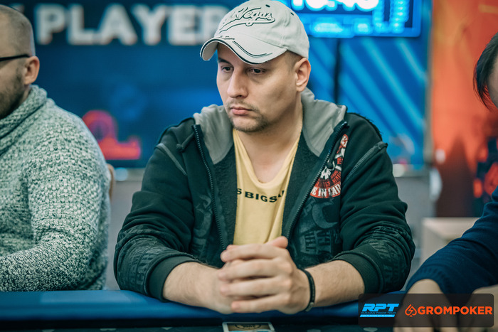Максим Гайтюкевич неплохо нажил шашек для финального стола, ближайший его преследователь - Илья Матус идет со стеком в два раза меньше. Спросил у Макса, как ему удалось набить такой стек, ответ улыбнул: