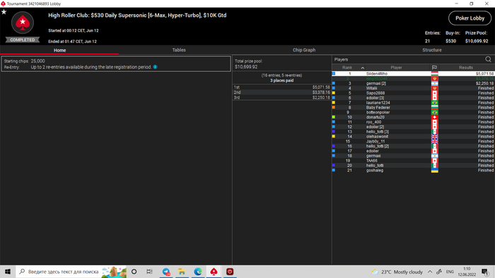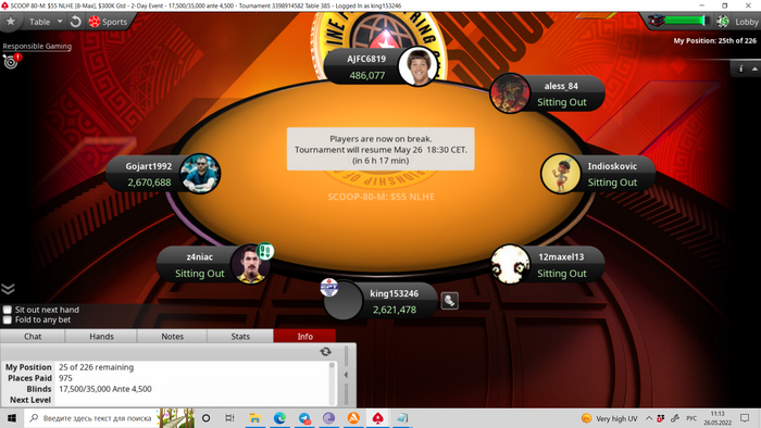 Вспомнил внезапно, что выигрывал в начале серии билет со 109 степа на косарь. У меня почему-то была уверенность что его можно использовать как билет на мидл мейн, но уточнил у сапорта и оказалось что я напутал. Пришлось катать) Сат прошел на удивление ровно и гладко, выиграл в 6-максе выставление и после этого сидел в автофолде пока румын одним за одним выбивал коротышей. Будет первый опыт турниров с таким байином, до этого самое дорогое на 2100 отбирался. Волнительно.