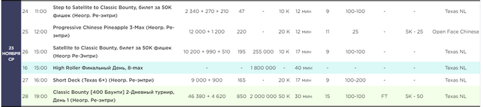 Продолжаем! Половина серии позади, впереди - пять дней покера в столице Приморского края. Вот такое расписание запланировано на шестой день серии, 23 ноября, в покерном клубе казино Tigre de Cristal: