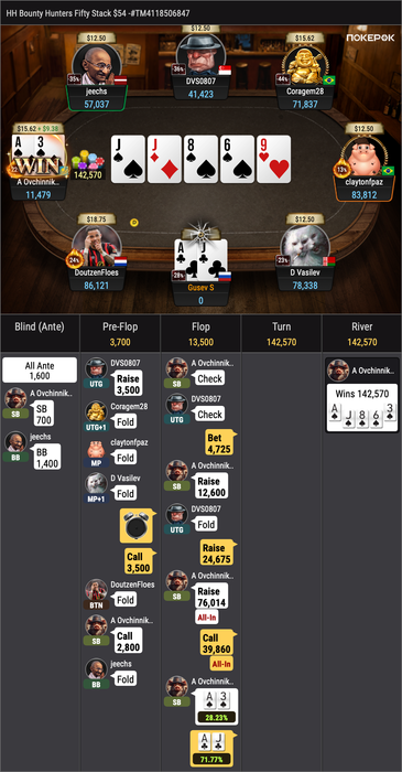Следующая категория - выставления где у меня примерно 70% эквити против примерно 30% у оппонента.