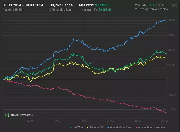 1. Те же 30к рук в месяц. Не понимаю, можно ли доверять SmartHand, ведь если учитывать его, то у меня 888 + старзы в этом месяце отыграно 35к рук, а Hand2Note показывает только 30к. В прошлом месяце было так же.