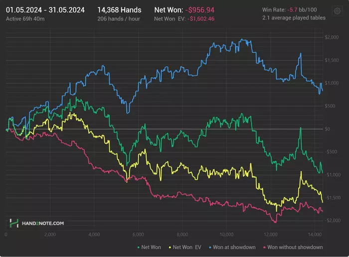 Наверное, стоит учитывать рейкбек, итого за май - -606,95$. Обидно не за сам минус, а за то, как ощущаешь себя, как игрок после этого. Это касается не только покера. Когда я проигрываю в настольных играх, то меня накрывают примерно такие же ощущение, как после очередной закрытой в минус сессии (хотя в настольных играх, очевидно, деньги я не проигрываю). Проработка тут должна быть момента, что проигрывать - это нормально, часть этапа роста, невозможно всегда выигрывать и тп.