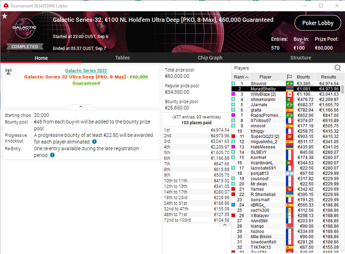 Не так давно, наш тренер miyamu занял второе место в турнире Galactic Series-32: €100 NL Hold'em Ultra Deep [PKO, 8-Max], €60,000 Guaranteed и заработал 6,155€.