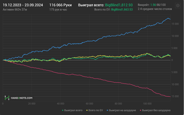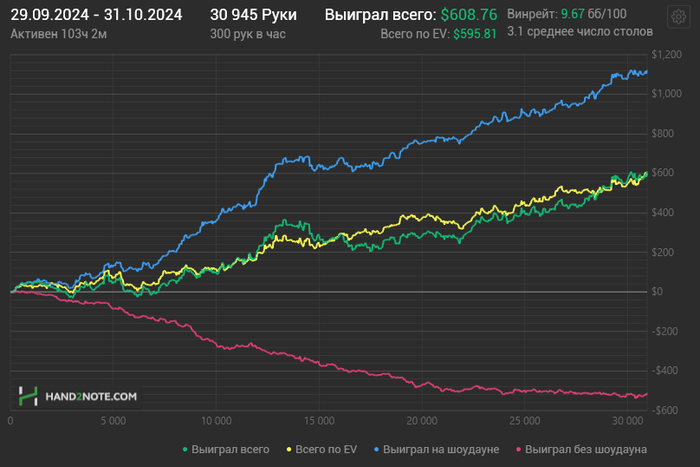 В начале сентября мои винрейты упалли обратно в пол, это огорчало, но что было то было, это не важно, важно что будет впереди. Количество рук опустилось до 130 в час, игры стало еще меньше и теперь я зачастую просто смотрю в лобби, если принять это в расчет я играю около 100 рук в час рабочего времени.