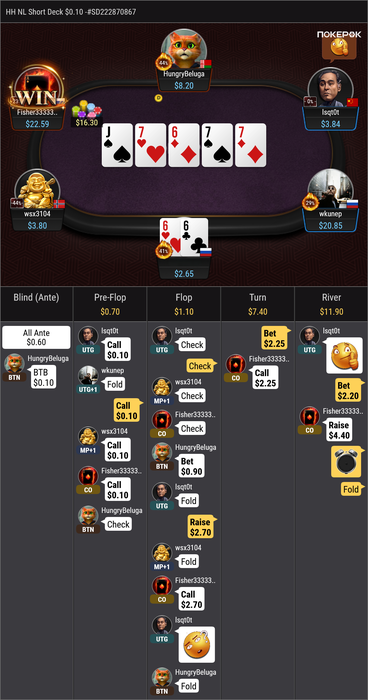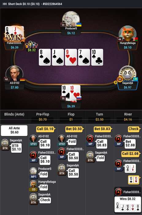 Этот только часть того, что произошло в моих раздачах за одну сессию с фишером. Добавил в начале одну раздачу с mrsbluffer, поскольку тоже помечен у меня как подставной товарищ.