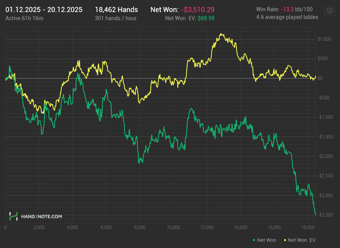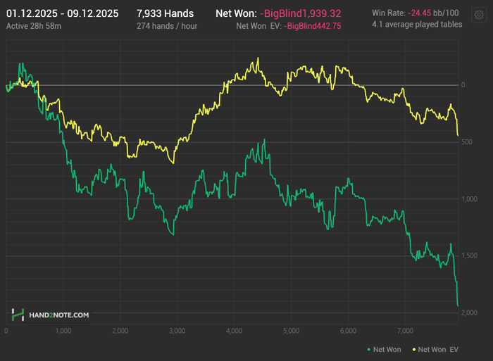 Вместе с бомбпотами, мультипотами и другими раздачами которые не сохранились, наверное будут те же 10евбб, которые я показываю везде где играю, с такими же результатами какие я показываю везде где играю, ну может чуть лучше. Честно говоря никаких эмоций это у меня уже не вызывает, только усталость. В декабре задача отыграть хотя бы 50к рук