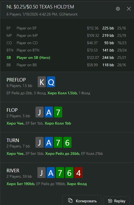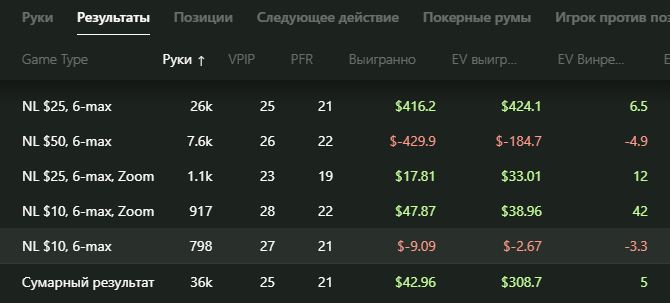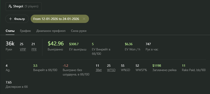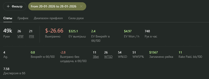 Я в конце подумал, что играть такие дистанции 750 рук/час со статами 26/21 видимо не является самой оптимальной затеей))