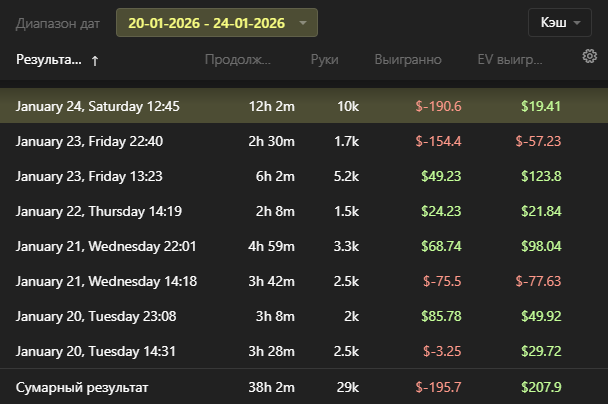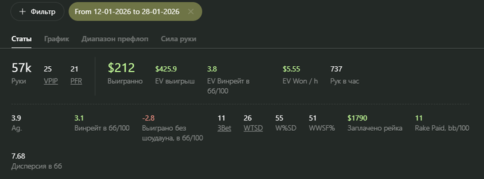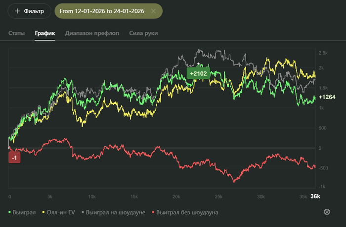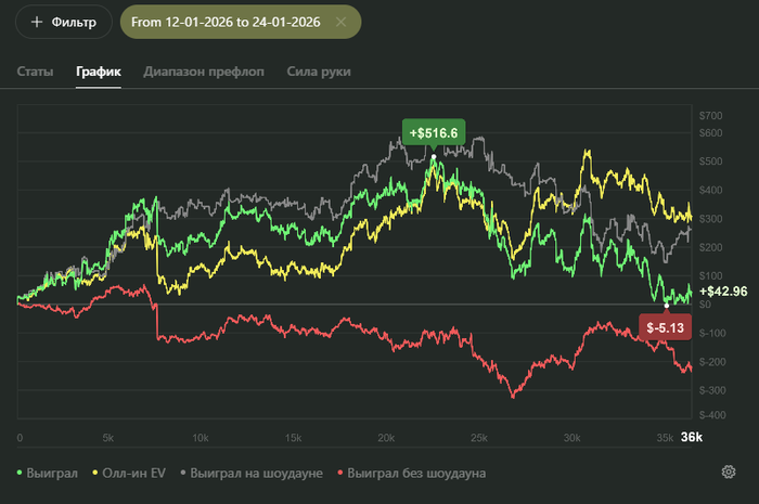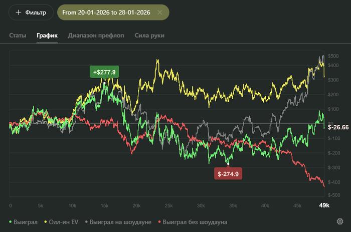 Видно, что работу над игрой в декабре я проделал хорошую. Но новым стратегиям нужна обкатка, но видно, что игра изменилась, т.к. красная поднялась. Осталось правильно подбирать споты. Ато у меня пошло, что я везде пошел телефонить фишей.
