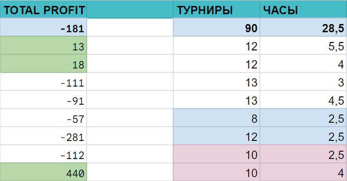 В очередной раз мало накатал, но диспа щадит и на профит не пожалуешься. Количество турниров в час уменьшилось, но это потому что во-первых не гружу теперь би меньше ~10, а во-вторых понял, что граница существенного ухудшения игры у меня проходит по 8 столам и стараюсь больше не грузить, хотя привык к 9-10. Лучше меньше, да лучше.