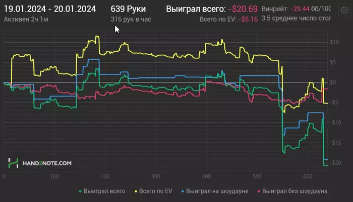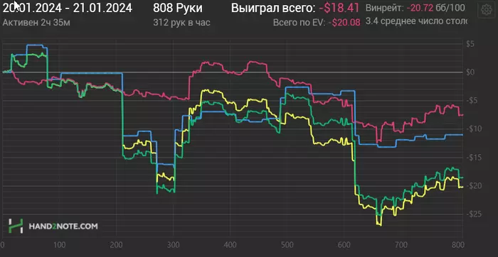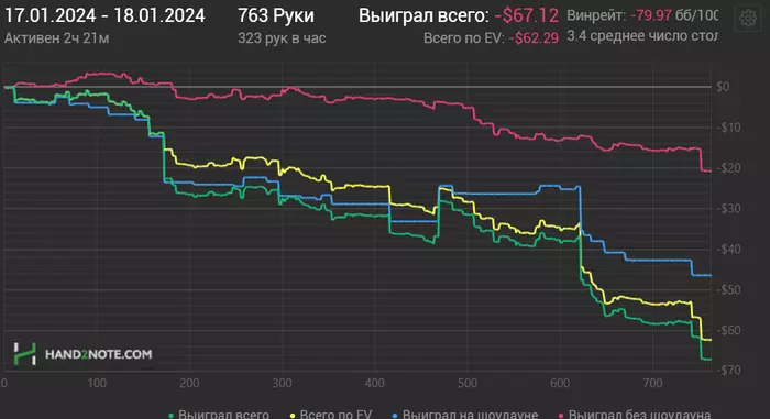 Обычно всё это немного компенсируется и в твою пользу, особенно когда за столом ребята с впипом 70-99, но сегодня на 4-х столах я выйграл только один банк в 70 бб
