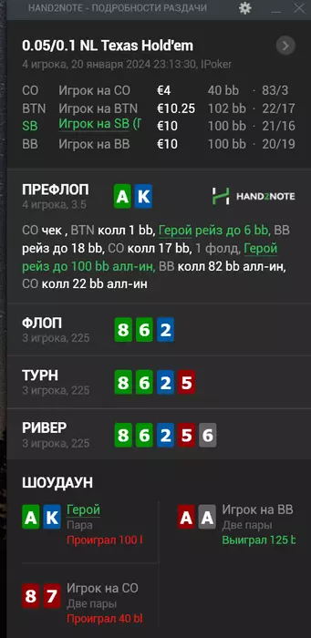 VitalNN, 2,5 раздачи под вопросом, как по мне... по второй почему пропущен бет терн, а по 5-й почему колл ривер ?