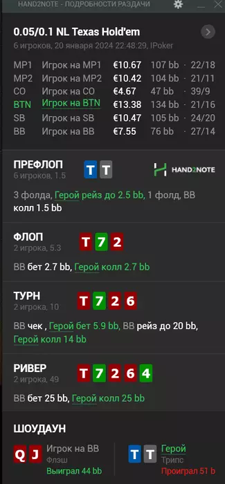 glori0s, Это так складывается просто, у меня нормальная линия...я чекаю в надежде забрать больше...Ну дам я ему пот или 2/3, он вообще иногда сразу дамы зароет по такой динамике,и по риверу не факт,что остаток стека загрузит. А так после моего чека он отбивает овербет или пуш ривера с JJ и QQ не реже и сам лид сыграет иногда...Без позы да,я всегда тут буду второй баррель лепить,а IP я играю по разному и не считаю,хоть убей,что это серьезная ошибка.