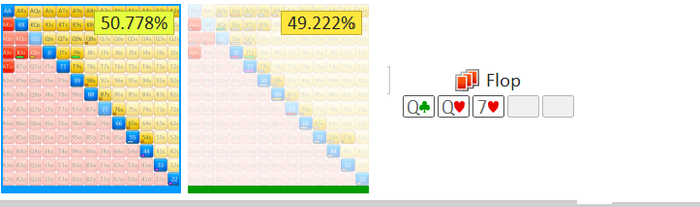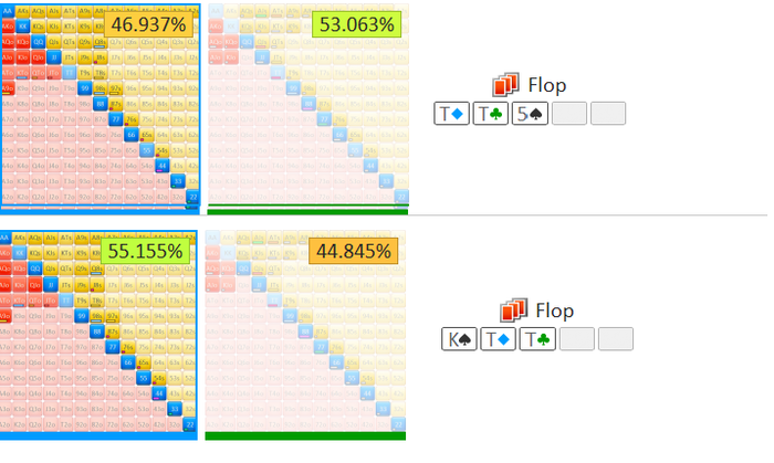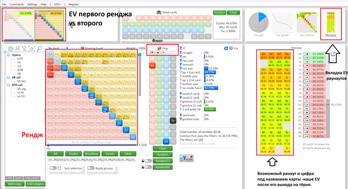 Интуитивное предположение, что зеленый цвет это хорошо, а красный плохо - верно. На флопе QT2 прекрасные ауты для нас это короли и тузы(цифры под картами, это наше EV после выхода этой карты на тёрне. И плохие раны - низкие карты, которые открывают низкие дрова и сэты, так как у диапазона BTN будет преимущество по этим комбинациям. То же правило работает и для второго флопа(и для любого флопа): Высокие карты - хорошо, поехавшие низкие дрова - плохо. Советую зайти в мультплеер мод во флопзиле, выставить ренджы и порандомить флопы. При этом закрыть рукой секции, где пишет ЕВ ренджей и ЕВ ранов, и попробовать предположить, строя логическую цепочку в голове, кто старше и какие раны хороши, а какие плохи. Краткая инструкция, как найти нужные цифры: