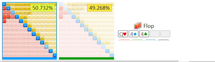 Исходя из предыдущих заметок и скриншотов, легко сделать вывод, что нашему ренджу отлично подойдут низкие дровяные карты и мы боимся высоких карт. В следующем споте наш рендж сильно впереди, но посмотрите на сколько падает наше ЕВ по выходу тузов и королей, которые ошибочно могут быть восприняты, как "О, туз тут наша карта, дожимаем".