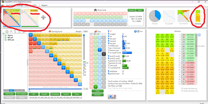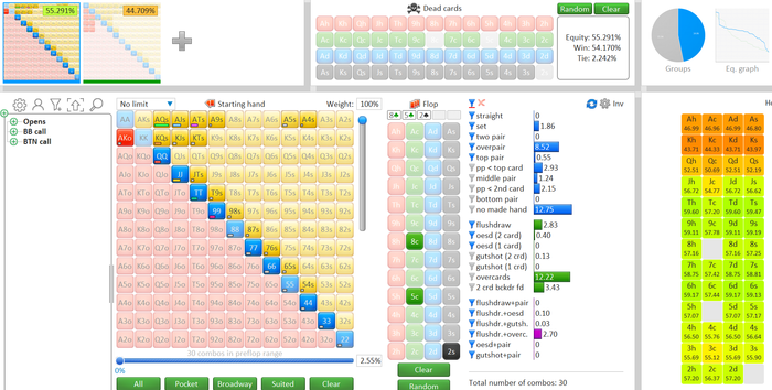 Один из них разберём вместе, чтобы понять логику. Берем два диапазона(btn vs bb у меня), вбиваем нужный флоп и изучаем.