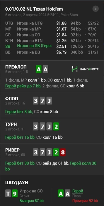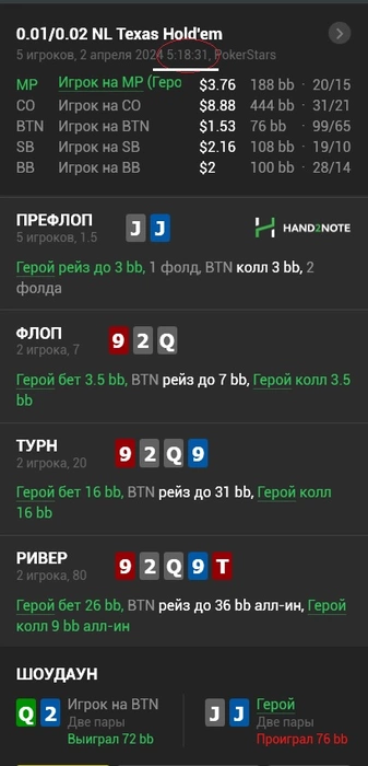 2 раздачу и комментировать нечего, пуш на стек по спаренному флопу не имеет смысла, либо все скинут, либо увидишь трипс или фулхаус. Могут оплатить 1010, JJ, 99.