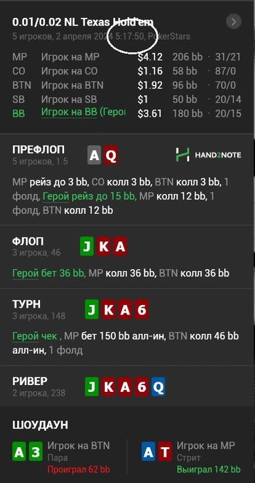 Утро было прекрасно и ничего не предвещало неприятностей, отыграв 400 рук был в +2БИ и думал уже заканчивать и идти на завтрак))) как откуда невозмись появилось в рот е-бись))) ( иззвиняюсь за мой французкий))))