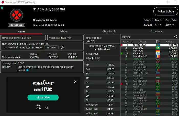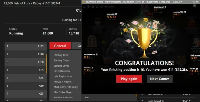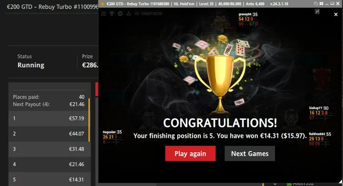 Турнирная сетка у меня довольно обширная, так как играю в пяти румах. Шестой - Покерок, пока даже не задействовал. В целом, доволен своей игрой. Именно своей... конечно, стараюсь придерживаться базовых вещей, вроде "открывашки" "пуш фолд" и тд, но я очень часто меняю стиль, часто играю на интуиции, не придерживаюсь однообразного подхода за одним столом, могу быть супер агро макакой, а через какое то время включаю режим нитового фиша, который открывает только премиум руки, чередую в общем)