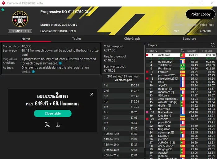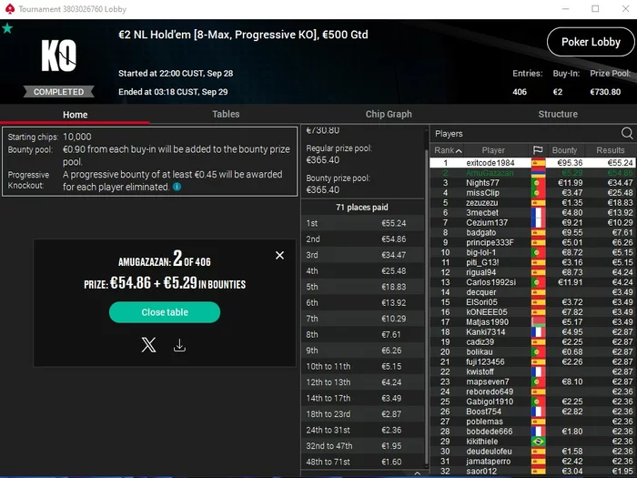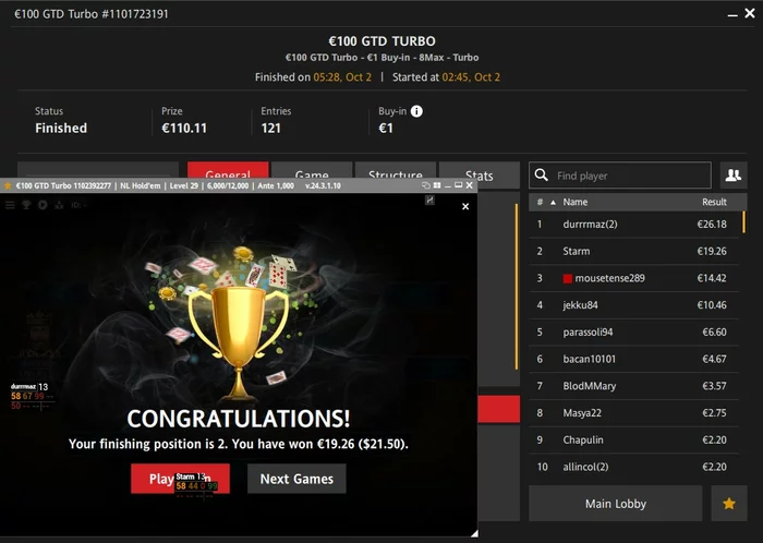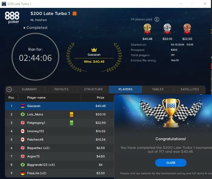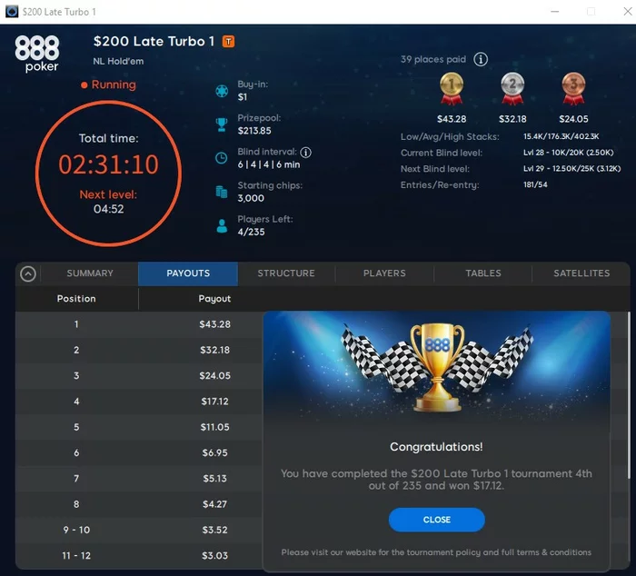 Сыграл 20к рук ~190 турниров, с 0.5$ - 2€. Финальных столов - 9. Лучший результат 2 место 60€. В общей сложности банкролл увеличил ~ на 150$.