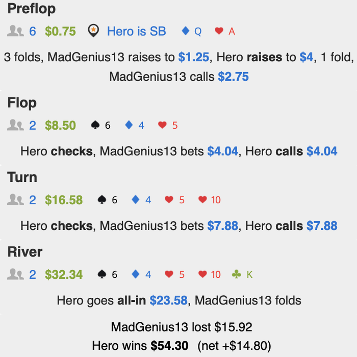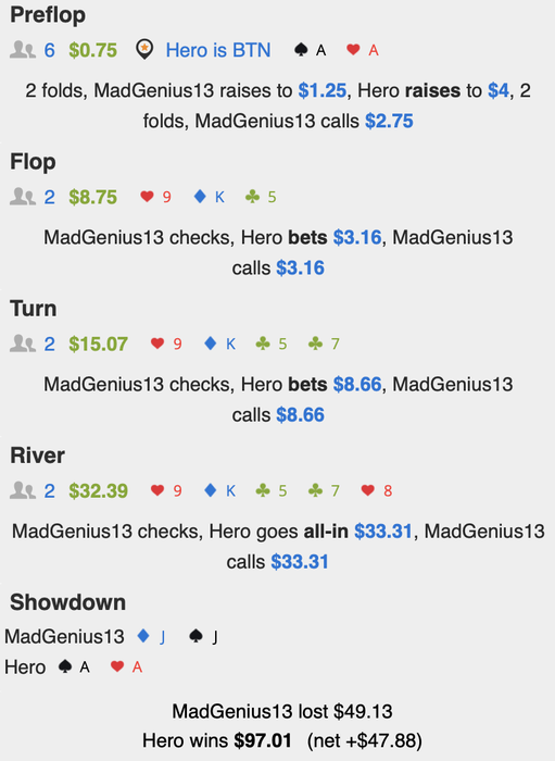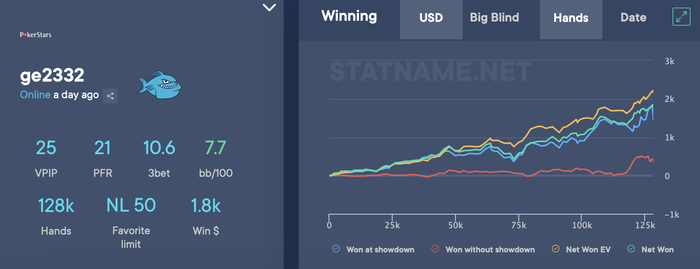 А у парня результаты достойные, по ев похоже у него 10бб+ винрейт!