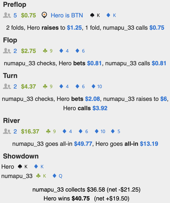3б от него на бтн вс утг я (кулер мой натс флеш в его король хай флеш с флопа) флоп чек-чек, терн бланк чек 3/4 от него я колл, чек бланк ривер он допихал 1к1 банк, после крестиком закрыл все столы со мной 😹😂