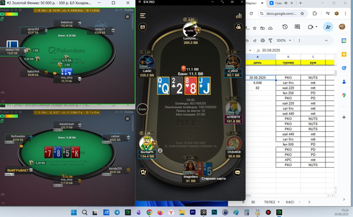 Сегодня откатал полноценную рабочую сессию. Подключил себе дополнительно NUTS POKER, т.к. там есть пару хороших турниров днём, в основном ПКО. И теперь играю 3 рума. Выглядит это так: