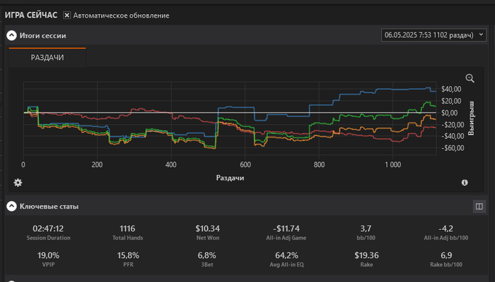 Привет всем!Пару дней не играл после нескольких минусовых сессий подряд,отдохнул от покера,психологически восстановился.Сегодня с утра так покатал,обидно проиграл против фиша КК<66 и против рега бб вс сб ВВ<ДД, под конец сессии получилось парочку фишей зацепить.