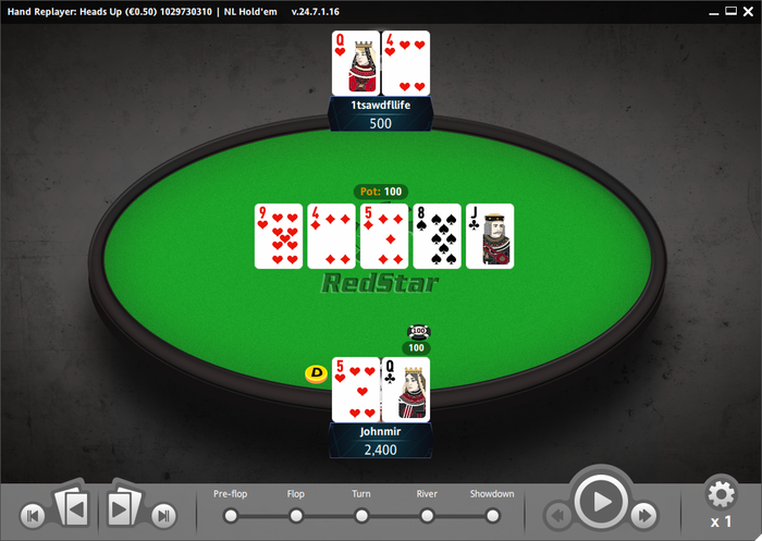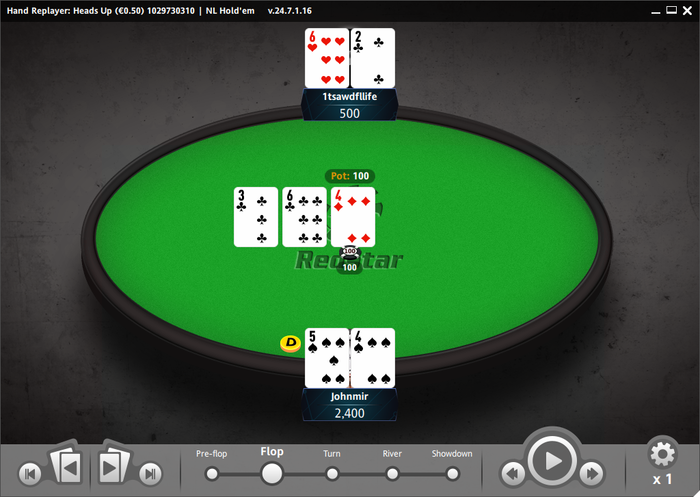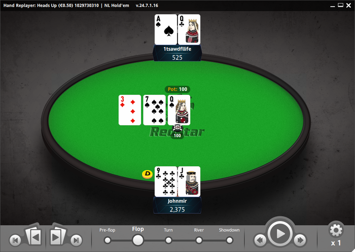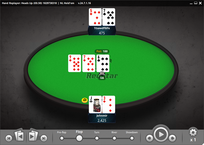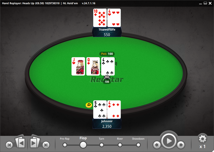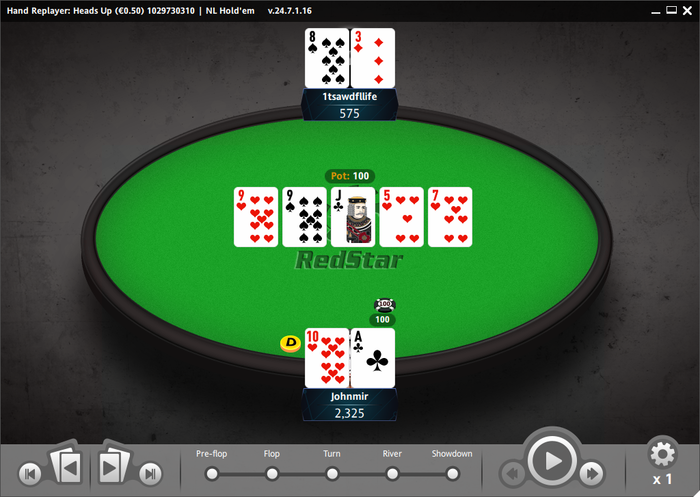 Раздается флоп. Я еще раз чекаю - он отвечает авто-чеком, раздается терн. И так до ривера до шоудауна, где мне и показывает его руки.