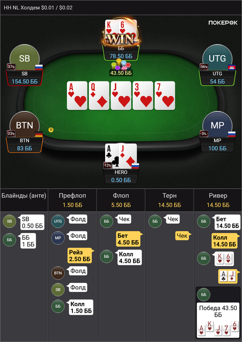 А так как ты поставил около 120% от банка (38-120)= -82% Ну ладно задисконтим слабые коннекторы и нижние карманки - решение в любом случае минусовое. Посоветую тебе приложение Holdem LAB(на андроиде точно есть) - самое быстрое и простое - посмотреть свое эквити. Ничего лишнего.