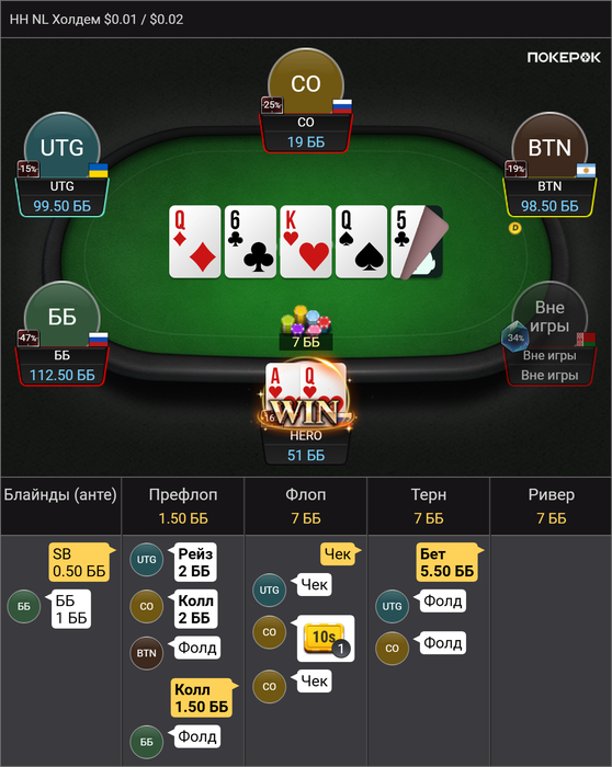 Или, наверное, надо было просто фолдить на ривере, но подумал что туз бы уже себя проявил, а вот про QQ как то и не подумал.