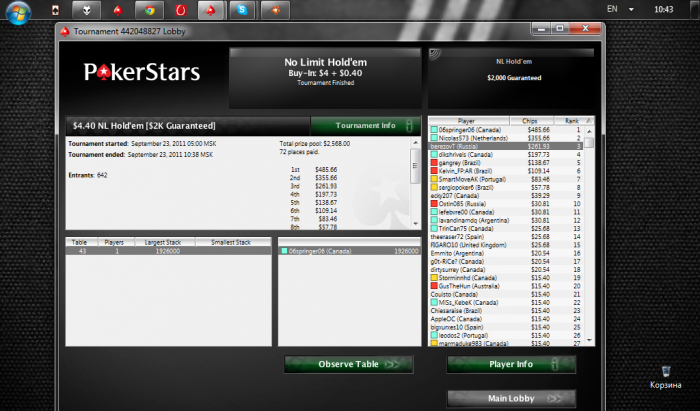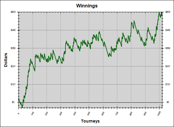 Сейчас не играю, так как бр ушел на этот вывод + покрытие всех моих долгов, которых набралось не так уж и мало. Так что где то после 23 числа я планирую либо сделать небольшой деп около 150$ либо отыграть недельную серию из 500 турниров 3.5$ turbo от бекера и таким образом заработать на дальнейшую игру. Кстати о лимите, отыграл я уже чуть более 1К таких турниров, чуть ниже график. Так что проблем с нахождением бекера, я думаю не будет.