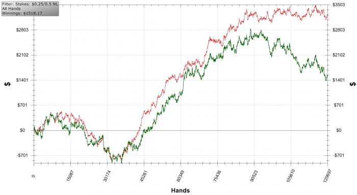у тебя довольно прямолинейный график. Ты проломил наконец-то даунтренд и образовал несильный но стабильный апртренд. В принципе могу посоветовать продолжать играть в такой же покер как ты играешь сейчас, и быть внимательным когда твои выигрышы подойдут к отметке на которой я начертил красную линию. Если ты её пройдешь гладко, то всё будет ОК.