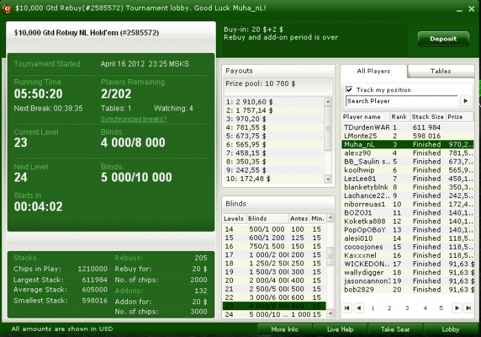 всего 23 турнира,айпокер подвел... с конектом что-то не то было... предфиналка пати 7,5кг предфиналка пати 4,5кг предфиналка пати 5кг несколько неглубоких итмов в ха вышли с равными стеками. немного тудасюда фишки погоняли,потом решающая: Grabbed by Holdem Manager NL Holdem $25,000(BB) Replayer ($1327,573) Hero ($1234,427)