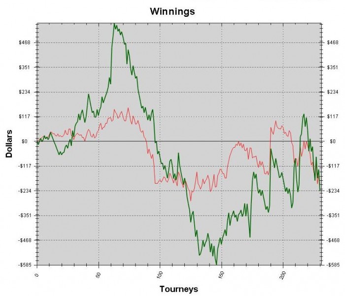 Сначала лечился пивом. Потом таблетками. Час назад выпил зеленого чаю. Вроде слегка отпустило, решил попробовать поиграть. Состояние неоптимальное, поэтому 15-й лимит. Экспериментатор херов! Ну вот, казалось бы, открой 10-12 столов и проверь свое самочувствие... Нет же, мне надо было 25 турниров запустить. Через 15 минут мне стало настолько хреново, что я был готов плюнуть на деньги, закрыть все столы, не доиграв турниры, пойти лечь и умереть. Пересилил себя, кое-как доиграл, тыкая по кнопкам как в каком-то анабиозе...