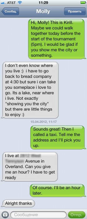 - Привет, Молли! Это Кирилл. Может мы бы могли бы погулять вместе перед началом турнира (до 5 вечера). Я был бы рад, если бы ты показала мне город или что-нибудь такое. - Я даже не знаю где ты живешь :) я должна вернуться на работу в 4:30, но конечно, я могу взять тебя в одно место куда я люблю ходить. Это озеро, недалеко от моего дома. Не совсем "показать тебе город" но там можно хорошо провести время :) - Звучит здорово! Тогда я вызову такси. Скажи мне адрес и я подберу тебя. - Я живу на **** Avenue в Оверленде. Ты можешь дать мне час? Мне нужно собраться. - Конечно. Я буду через час. - Хорошо спасибо.