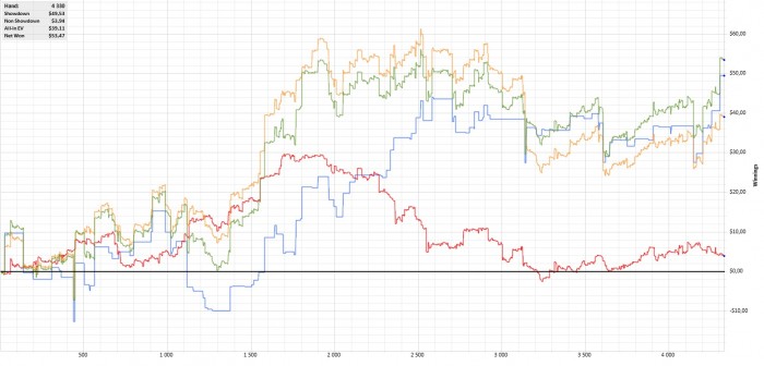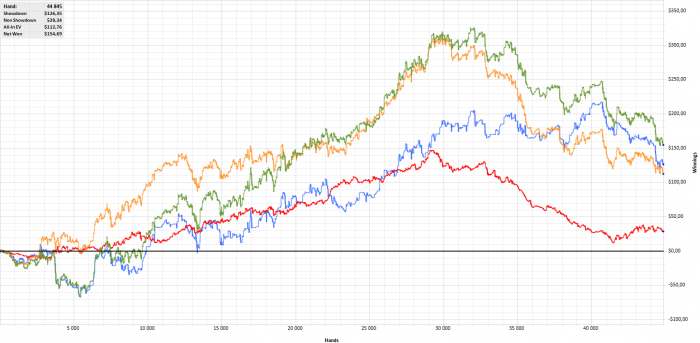 Проигрывал без шд)) Оппы не сдавались на стил, на 3 бет постоянно пушили, на цбеты не отваливались, упирался постоянно в карты у оппа. Ну это я считаю нормально, бывает такое, зато на этом отрезке синяя растет, что закономерно.