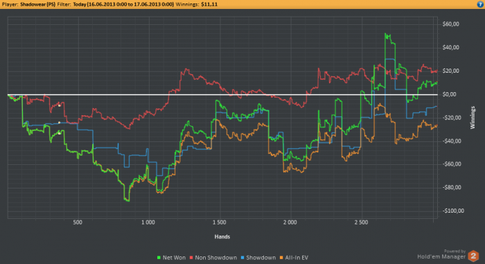 Полностью согласен. Вообще линия EV на графике только вредит: когда мы перебираем - на нее не смотрим, думаем, что крутые, рвем поляну. Ну или, в крайнем случае, что "Госпожа Дистанция" наконец-то одумалась и возвращает нам то, что потеряли в обидных раздачах. Когда недобираем по EV - вот тут самая засада. Нафига искать ошибки, ведь мы выставляемся лучше, чем соперники. Просто не везет. Все козлы. Да и пацаны поймут, когда график увидят. А на самом деле мы просто много косячим. И далеко не факт, что больше ошибок мы совершаем в "недоборных" сессиях (сужу по себе). Нужно просто научиться объективно оценивать свою игру. Хотя это ни фига не просто.