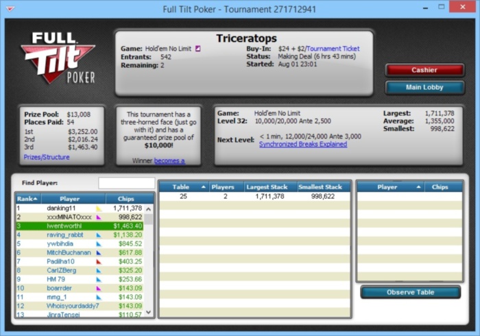 Full Tilt, 10,000/20,000 blinds, 2,500 ante No Limit Hold'em Tournament, 3 Players Poker Tools Powered By Holdem Manager - The Ultimate Poker Software Suite.