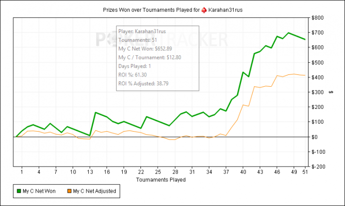 В начале получилось так что запускал довольно плохие турниры 30,60 лимита с кучей регов, больше не буду так в лобби садиться, когда нету времени пристально следить за составом.. Потом на 15 были просто офигенные составы, но у меня было не очень хорошее самочувствие и даже не было времени поесть, так как старался запустить побольше таких крутых столов, в итоге отыграл так себе, и ещё упустил около 10 таких турниров, потому что уже очень хотел есть и надо было прерваться(