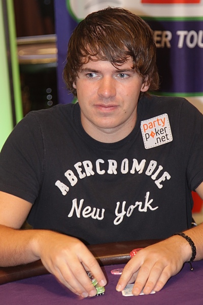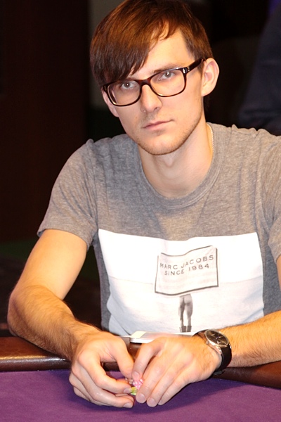 Потом заметил худенького юношу в толстенной оправе очков. Что это за гик? Стал всматриваться внимательней и проступил образ обладателя двух браслетов WPT и EPT Андрея Патейчука. Имидж он сменил давно (предыдущий лихой тинейджер мне нравился больше), но играть слабее от этого не стал. "Прилетел вчера ночью только..." - наверное изрядно поерзал на чемоданах (по моей статьи о ливанцах) перед поездкой.