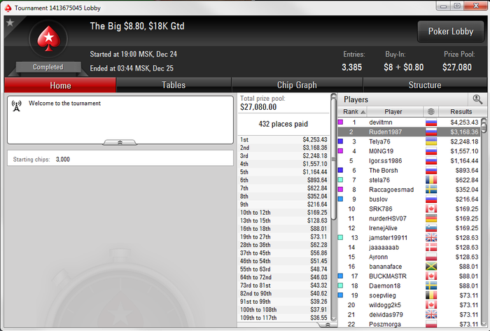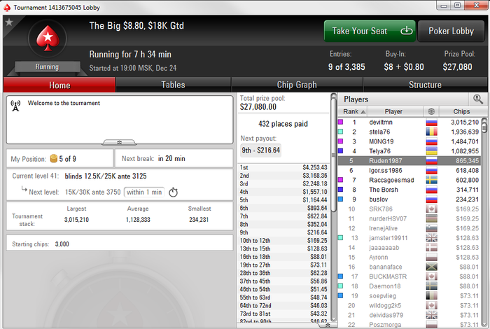Poker Stars $5.00+$0.50 No Limit Hold'em Tournament - t500/t1000 Blinds + t125 - 9 players -