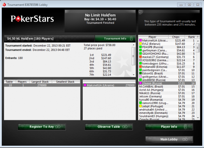Poker Stars, $0.91 Buy-in (15/30 blinds) No Limit Hold'em Tournament, 9 Players