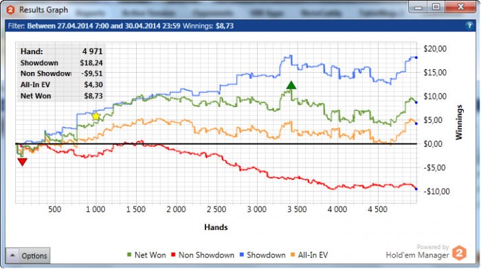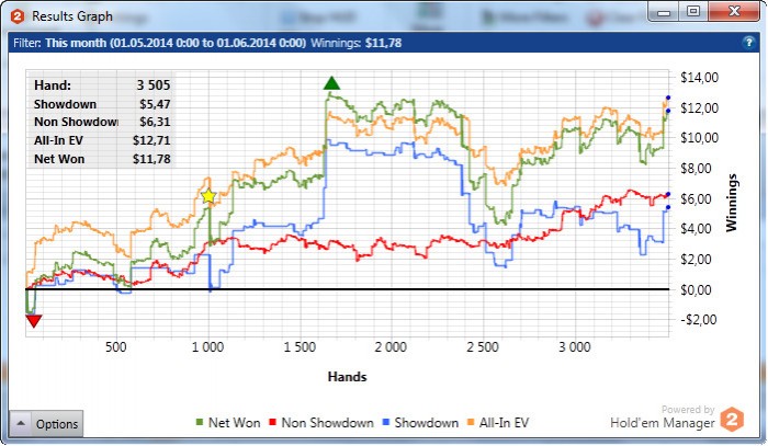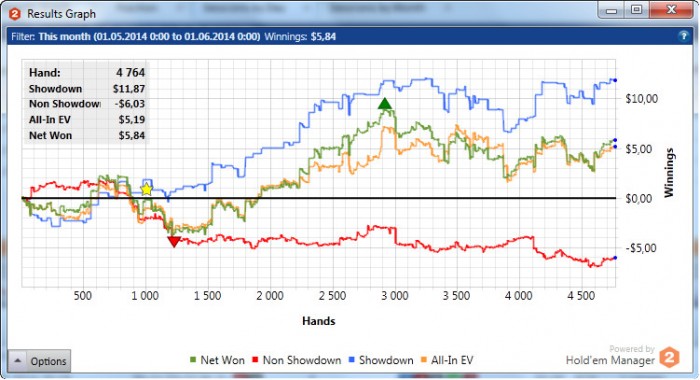 Выводы и заключения: Результатом недоволен. Старзы хоть и не до давали, но во многом я и сам виноват. Много сессий играл без должного настроя, в результате отдавал много лишних денег. Благодаря такому тяжелому месяцу, думаю, я многому научился. Ошибки в целях на месяц так же стоит отметить. В общем, все апрельские ошибки будут учтены в дальнейшей покерной карьере