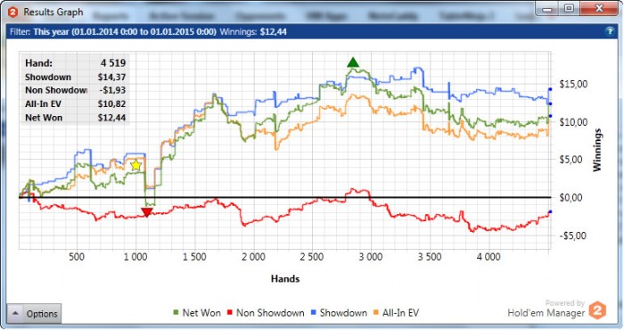 Почему? Сейчас обьясню. Линия ЕВ показывает доллар/эквити ситуаций с оленями. А олени - это всегда шоудаун. Как и синяя линия. А вот зеленая - это уже разница между линиями с/без шоудауном. Конечно, бывают ситуации, когда на наш олень оппы скидывают и это наверное тоже идет в желтую линию, но разница в эквити там существенная только с премиум руками, да и то против полного рандома + итоговый банк не значительный, как правило.