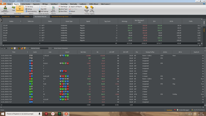 satyr26 @ 1.2.2018 Привет Алексей, у меня один вопрос- почему мой hm стату netwinnigsusd$ считает все в минус?, хотя некоторые турниры даже в совокупности у меня в плюсе и график прибыль не считает, а только проигрышь. Хотя остальная статистика верна. Холдем 2 покупал на официальном сайте. Если ответишь, будет очень приятно, за ранее спасибо.