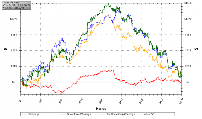 Эта раздача объясняет мой нотс. У тебя несбалансированная стратегия, ты играешь на открытых картах, и у меня нет сложных решений. Были варианты еще хуже: